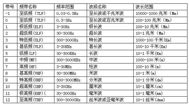 目前,根椐《中华人民共和国无线电频率划分规定》,我国已对9K~1000GHz频带内的无线电业务做出了规划,对无线电频带和波段也做了命名(见表1)。